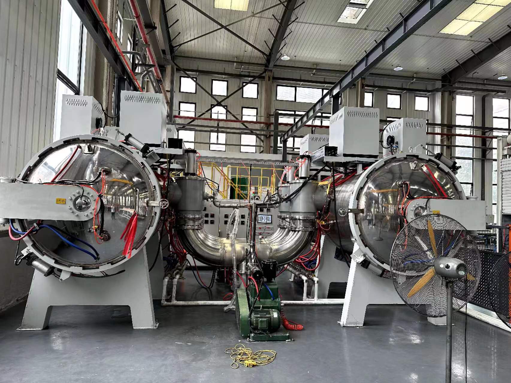 由兩個(gè)臥式主機(jī)(單室)、加熱供電系統(tǒng)、真空系統(tǒng)、水冷系統(tǒng)、氣動(dòng)系統(tǒng)、充氣系統(tǒng)、電控系統(tǒng)等組成。本產(chǎn)品結(jié)構(gòu)緊湊、操控簡便,自動(dòng)化程度高,具有可靠的全自動(dòng)控制、監(jiān)控、跟蹤和自我保護(hù)功能。